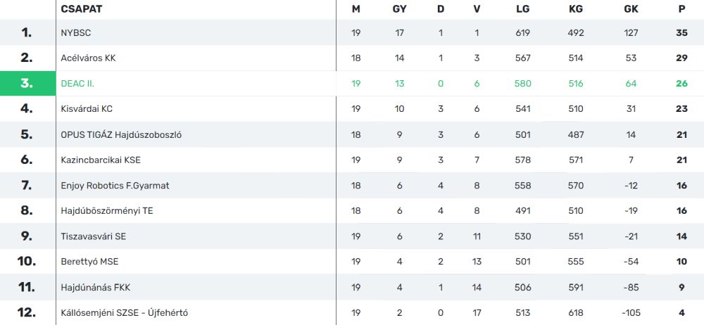A DEAC II továbbra is a harmadik helyen áll a tabellán, de hátránya három pontra csökkent az Acélvárossal szemben.